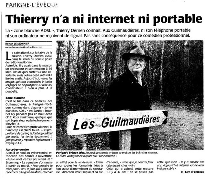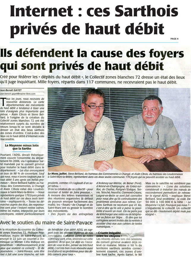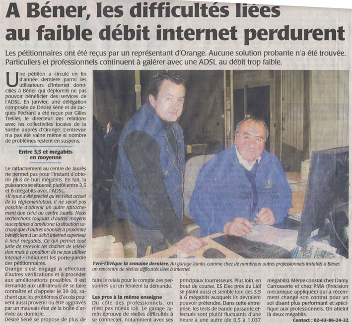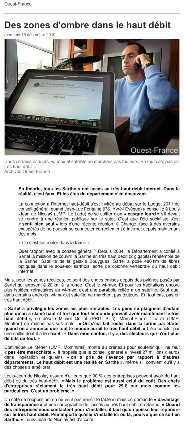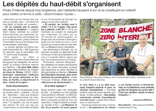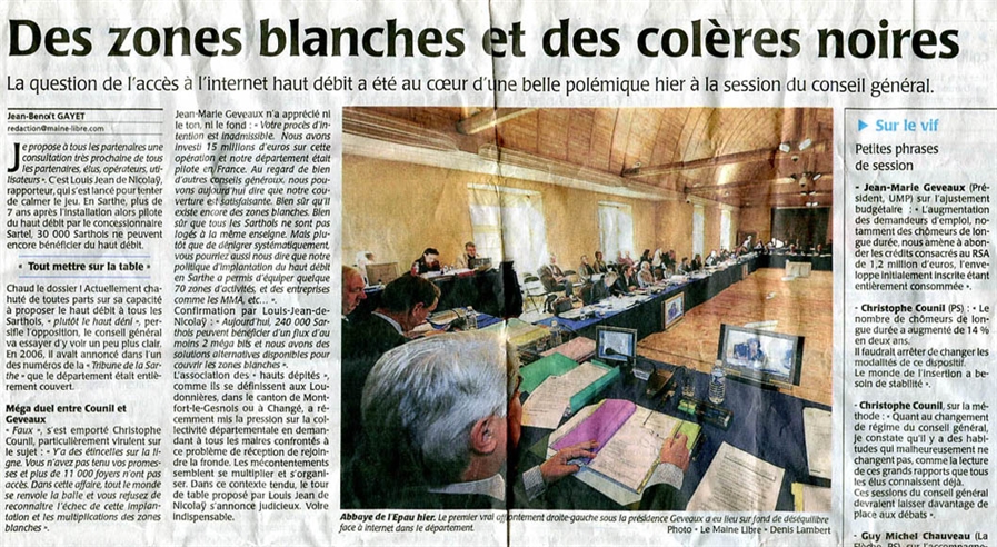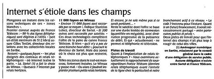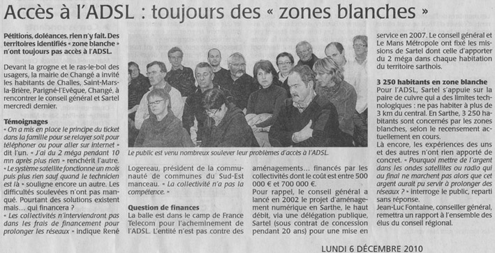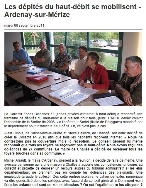 Vous trouverez sur ce site, les actions menées en faveur d'un accès à l'ADSL Haut-Débit - Dernières Nouvelles : Possible ou pas possible : le Haut Débit en sarthe (voir ci-dessous l'article du 31 Mars 2012 du Maine Libre